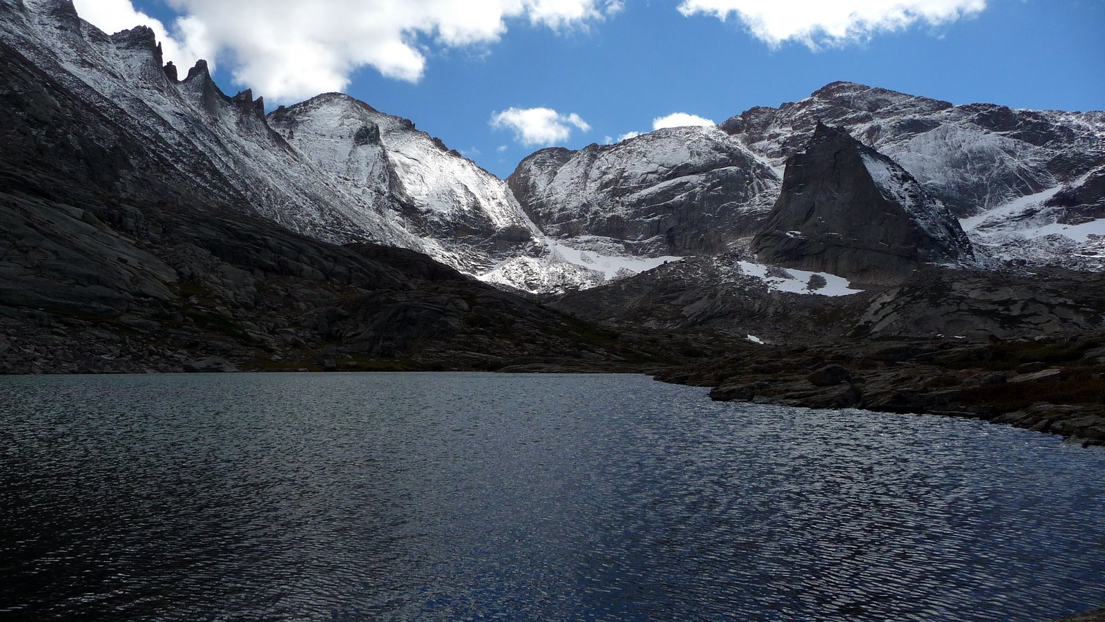 Climbing up to the broad shelf above Black Lake brought us to the snow line, and the freezing wind was ensuring that nothing was melting. Columbines are still blooming, but the snow is starting to fall. Green Lake shimmered with the white dusting all around.